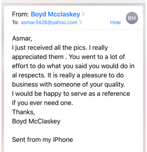 Asmar Akbar repaired a leak in my roof. The repair was done timely, effectively and professionally. Photographic evidence was provided illustrating the stages of repair.